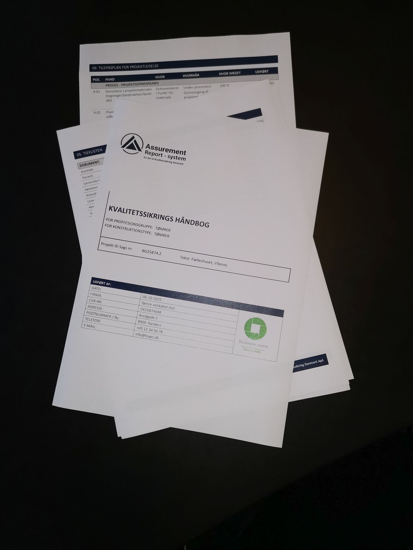Ligesom i den kendte kvalitetssikring samles alt i en Rapport. Vi har ladet ASSUREMENT APPen samle det for dig. Så behøver du ikke sidde og bøvle med billeder, tunge tekster og træls opsætning. Rapporten er opsat så den følger alle gældende standarter og regler. Den har alt det der kræves.